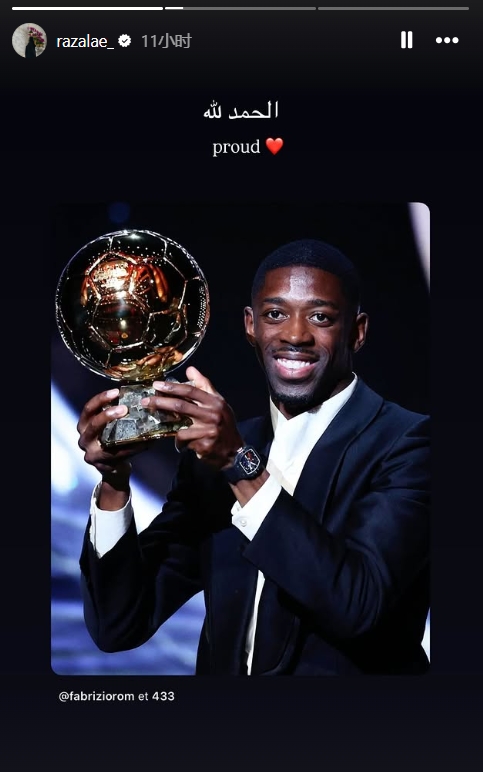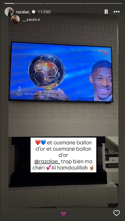09月23日讯 登贝莱荣膺2025年金球奖,他的妻子Rima Edbouche在INS上晒出一束鲜花和金球奖奖杯图。