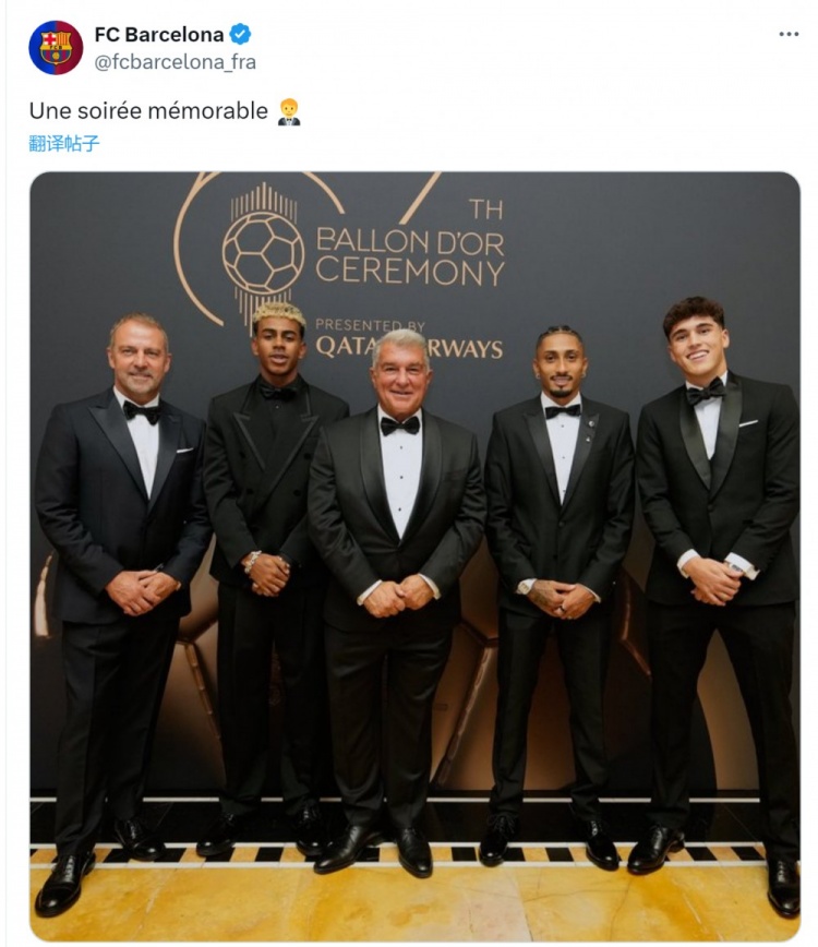 9月23日讯 巴萨官方更新社媒动态,晒出拉波尔塔与弗里克、亚马尔等人出席金球奖颁奖典礼的合照。