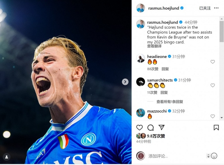 霍伊伦社媒晒出庆祝得分 的照片,苏超在线直播高清视频无插件并发文调侃:“霍伊伦在欧冠赛事 中连进两球,还都是德布劳内的助功 ——这完全不在我2025年的剧本之中。”